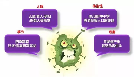 手足口病:一年四季都可发病,多发生于学龄前儿童,尤以5岁以下年龄组发病率最高,极易在托幼机构等集体单位传播,极少数重症病例可导致死亡。