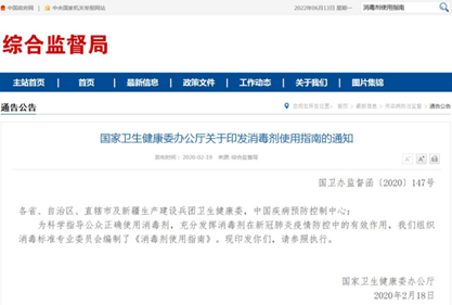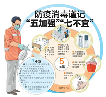 2020年2月19日,国家卫健委办公厅印发了《消毒剂使用指南》(以下简称指南),《指南》提出,新冠病毒疫情防控期间,应合理使用消毒剂,遵循“五加强七不宜”,真正做到切断传播途径,控制传染病流行。