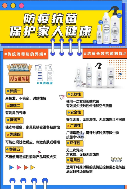 很多人听到这样不能、那样不能,就很头大,觉得一点都不方便,要不就是消毒不到位,要不就是有腐蚀性,因为心理作用都不敢用了。现在有能解决这些问题的小能手——洁蕴长效抗菌触媒。成分安全,无毒无腐蚀性;操作简单,均匀的喷涂于物体表面和环境空间,达到长期消毒杀菌的效果,日常的衣物、书包、手机、钥匙、儿童玩具等都可以直接使用,健康又无毒,也可以对整个室内环境进行消毒杀菌,长效又安全,能带上飞机、高铁、公车等公共交通工具,外出、旅行、乘车,想喷哪里就喷哪里,能有效减少接触性传播和空气传播(含飞沫、气溶胶),预防感染和交叉感染,让您和家人放心、安心使用,健康防疫,远离细菌病毒。