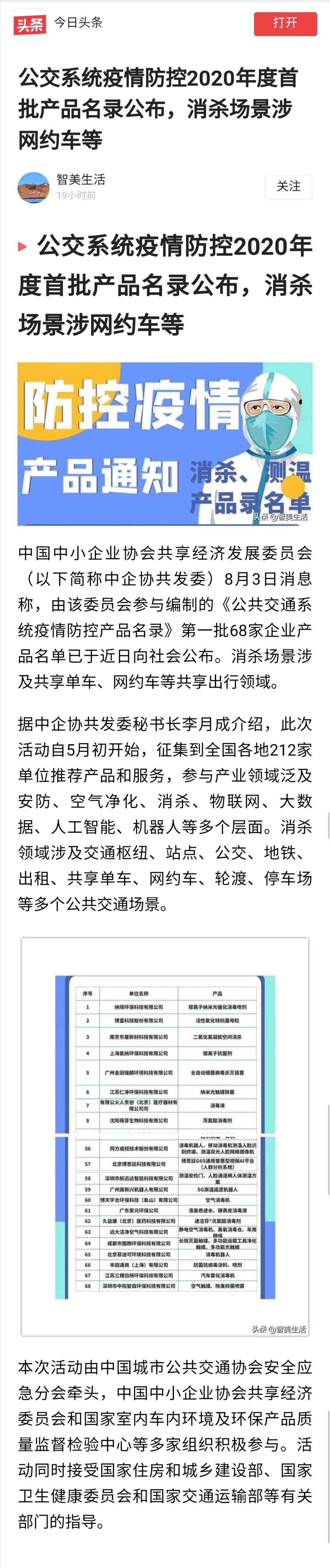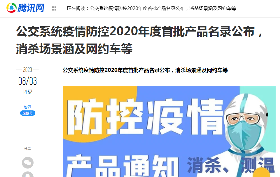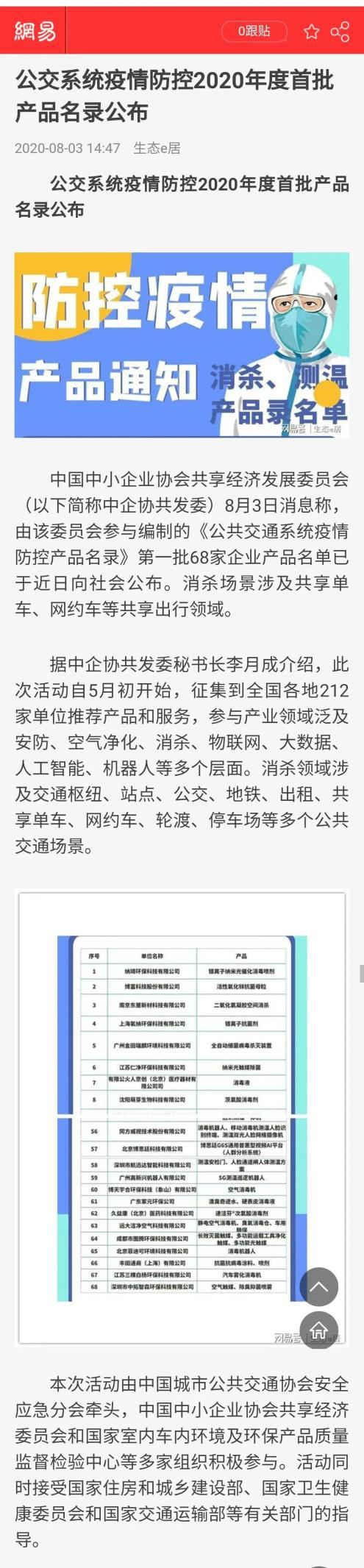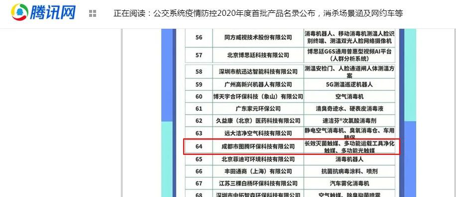 2020-08热烈祝贺我司长效灭菌触媒、多功能运载工具净化触媒、多功能光触媒荣登公交系统防控2020年度首批产品名录。