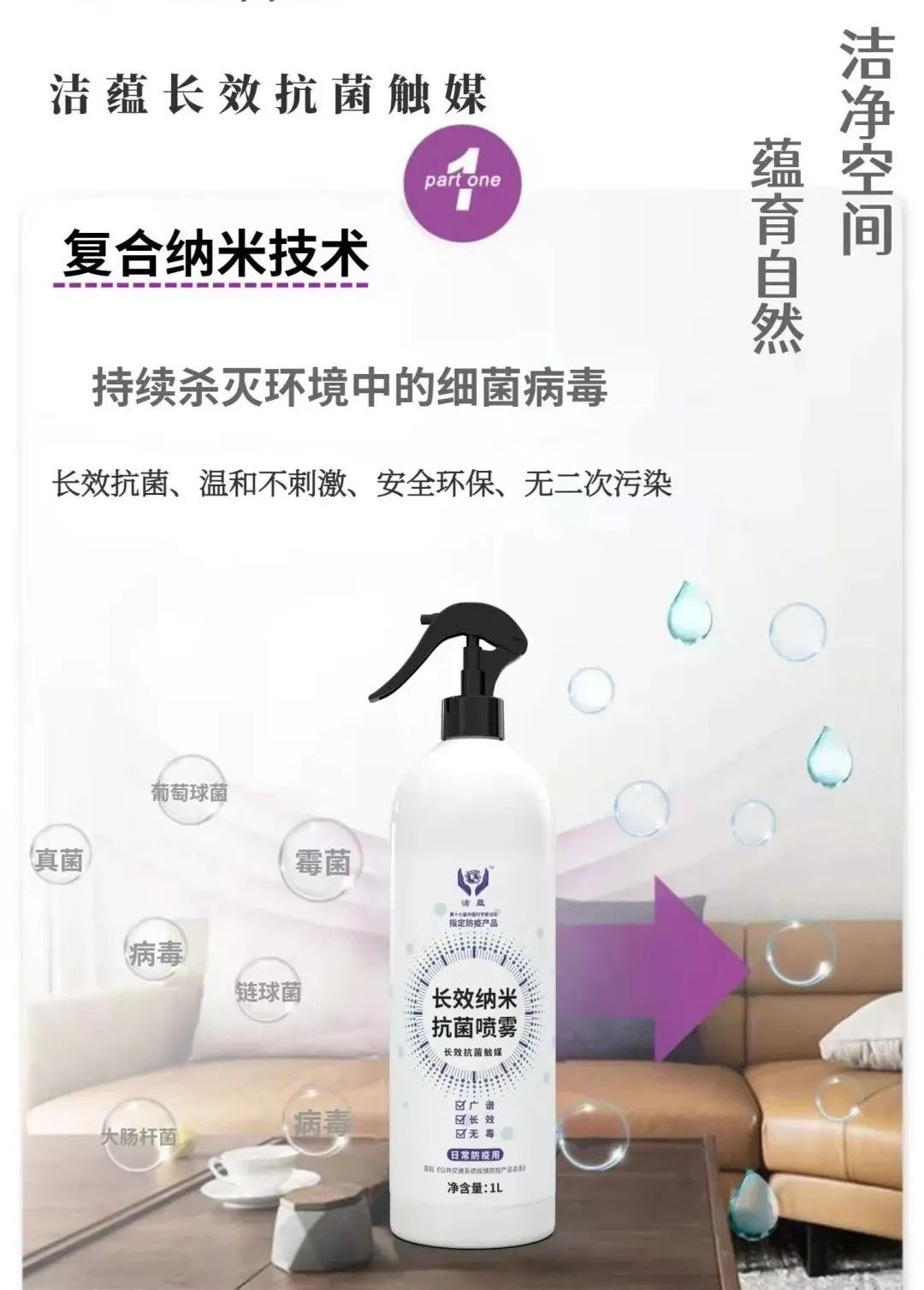 洁蕴长效抗菌触媒,适用于物品表面和环境空间长期消毒抗菌,有效防治生物污染,并减少接触性传播和空气传播(含飞沫、气溶胶),经国家权威检测中心检测,抗细菌率高达99%。使用一次,实现持续消毒效果,适用于各种细菌、病毒等。