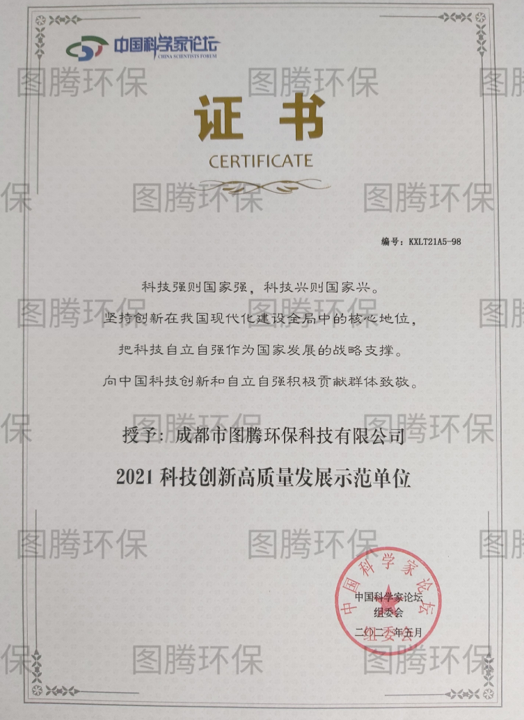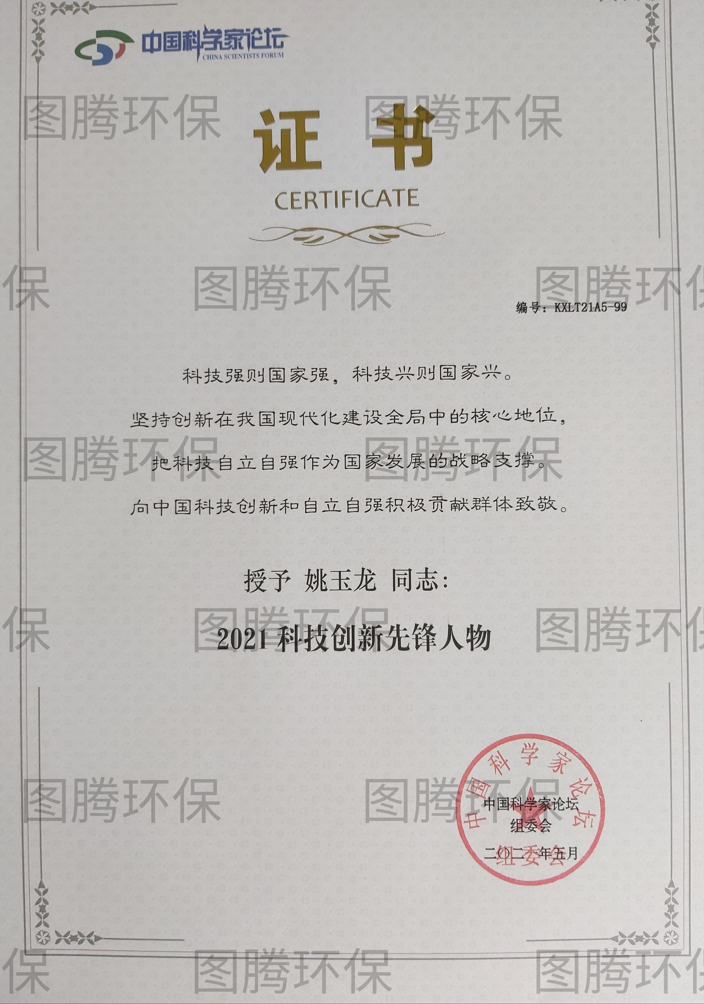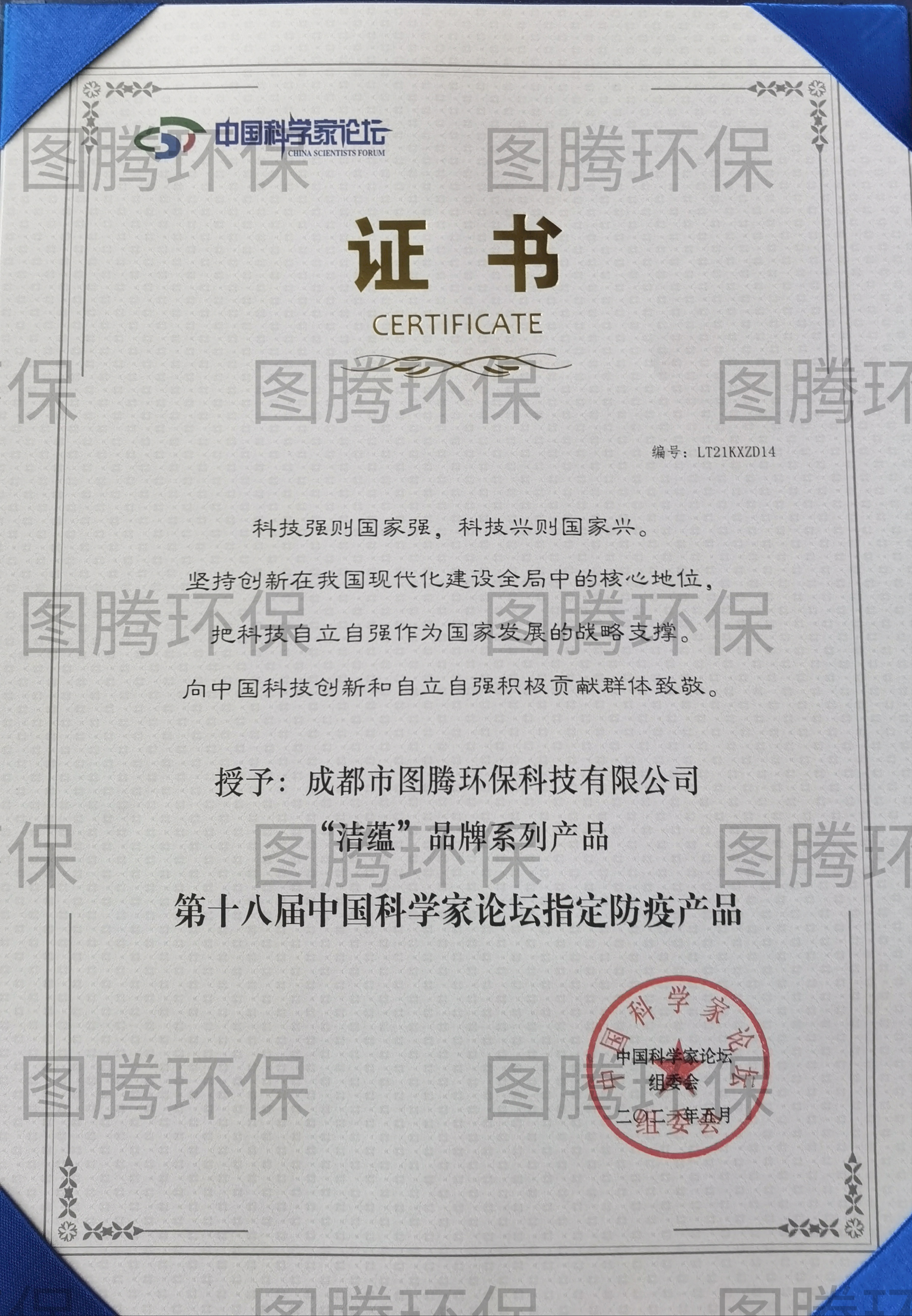 成都市图腾环保科技有限公司在本届论坛中再获佳绩,被授予“2021科技创新高质量发展示范单位;我司总经理姚玉龙先生被授予“2021科技创新想先锋人物”;”洁蕴品牌系列产品也继第十七届中国科学家论坛之后,再度成为第十八届中国科学家论坛指定防疫产品。