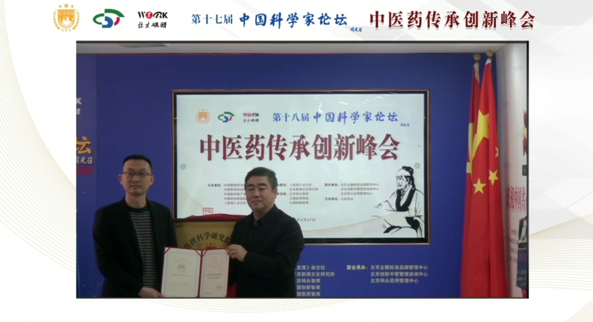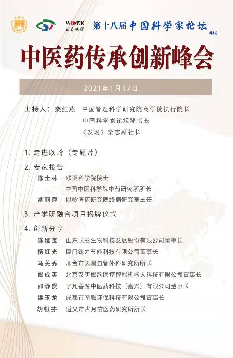 2021年1月17日15点,第十八届中国科学家论坛云峰会——中医药传承创新峰会在线上召开,此次云峰会由中国管理科学研究院商学院、中国技术市场协会、中国高科技产业化研究会、中国科技体制改革研究会、《发现》杂志社主办,《发现》杂志社、北京新闻文化研究所承办,中国管理科学研究院商学院院长、中国科学家论坛主席、《发现》杂志社社长陈贵、中医药传承领域的院士专家在会上作专家报告和创新分享。