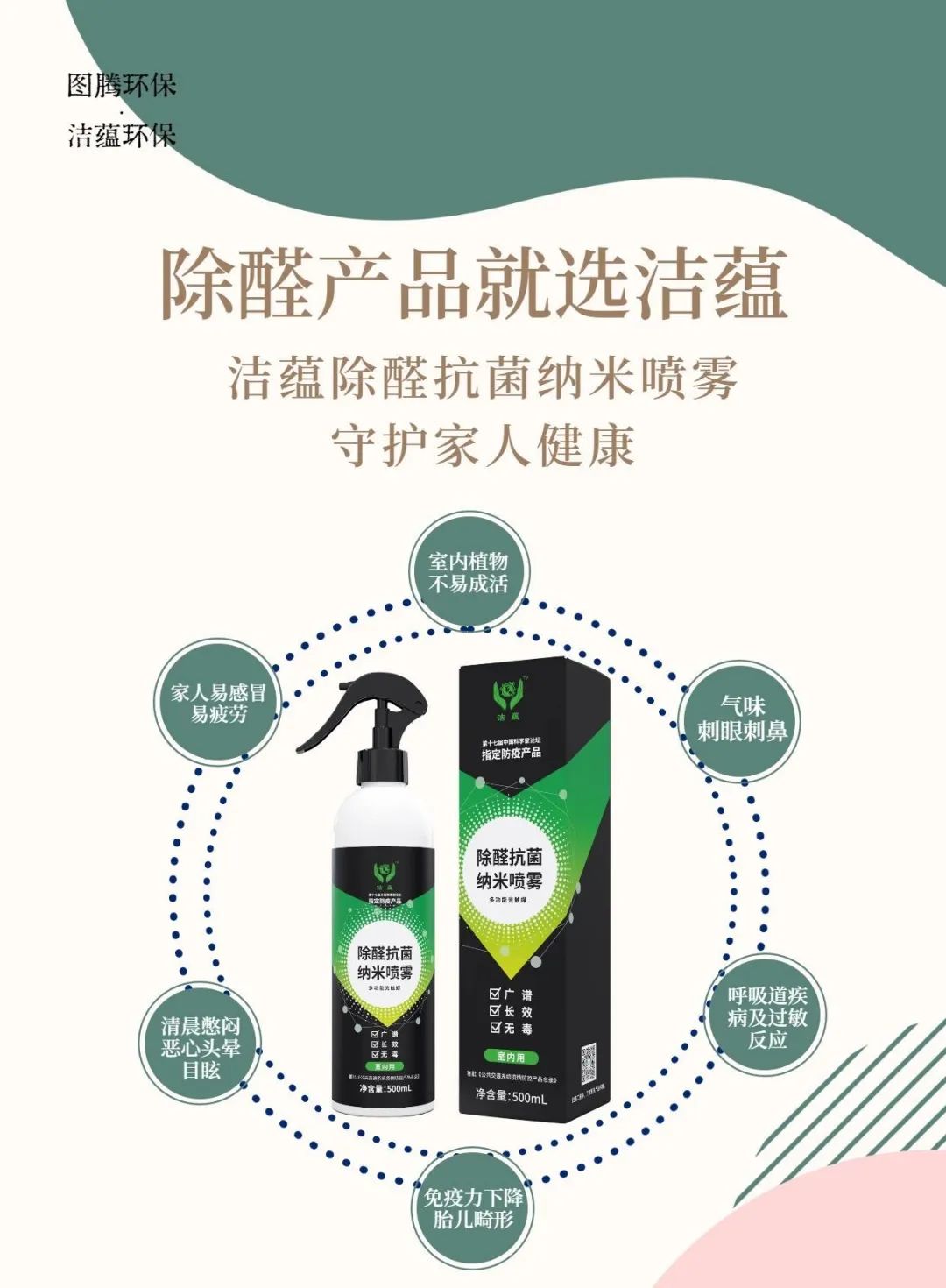 能长效、广谱、无毒、无刺激,喷涂后能持续杀灭环境中的各种细菌、病毒,减少接触性传播和空气传播(含飞沫、气溶胶),经国家权威检测中心检测抗细菌率达99%。