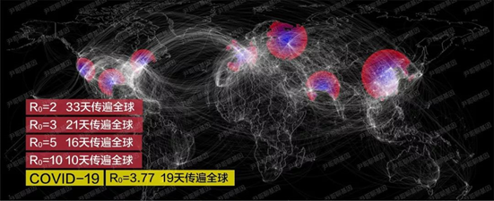 上面的例子R0=2(一天传染两个人),如果等于3呢?时间就会缩小为21天。如果等于10,那么感染100亿人也只需要10天。当然这是纯粹的理论值,因为现实世界中,完全不干预的情况是不存在的,这就是人类发展公共卫生事业,利用科技抗击疫情的意义所在了。![]()